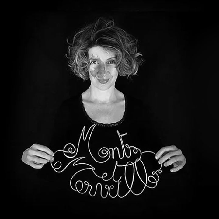 Using wire or brass, she brings words to life, creating unique pieces with her characteristic round calligraphy.