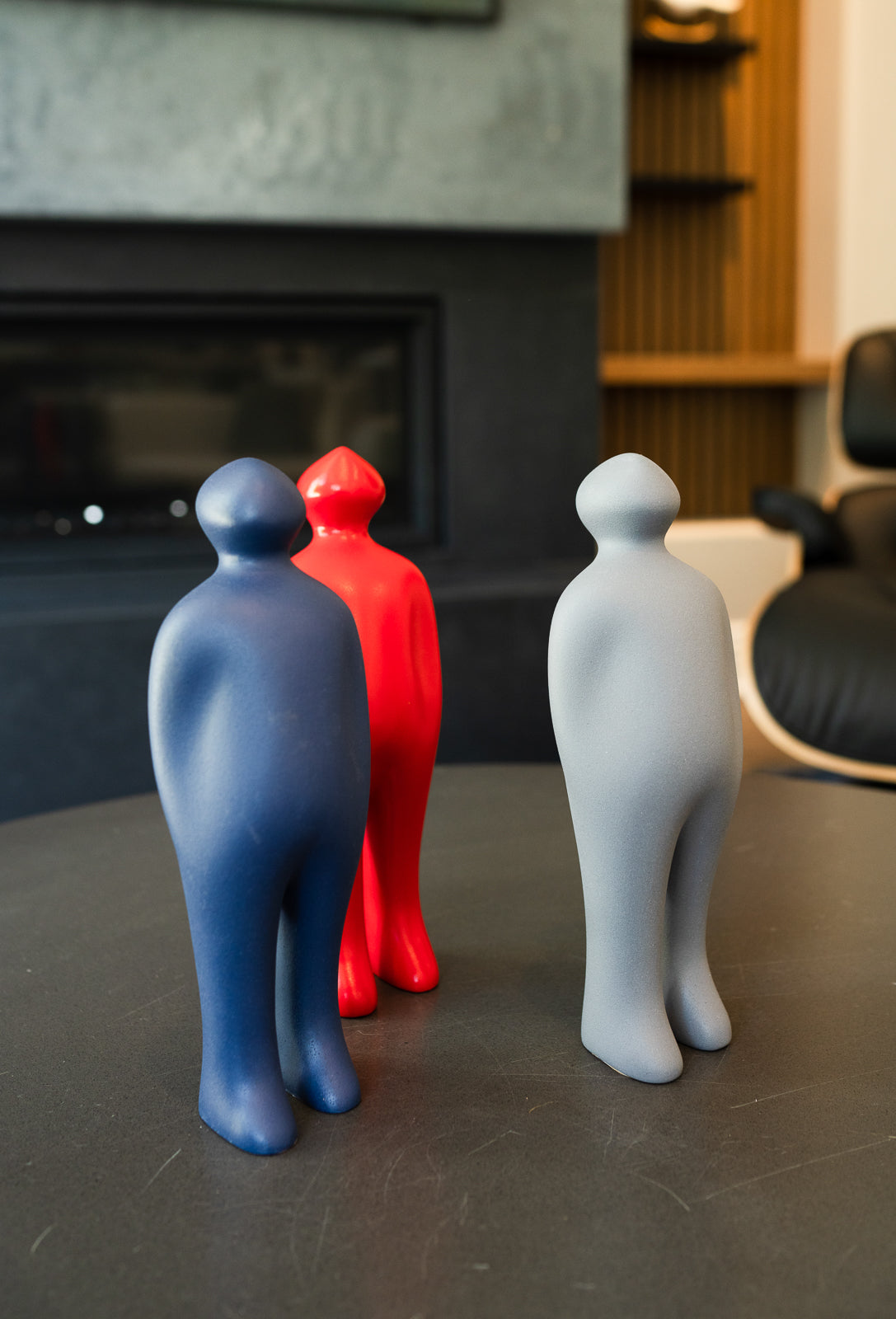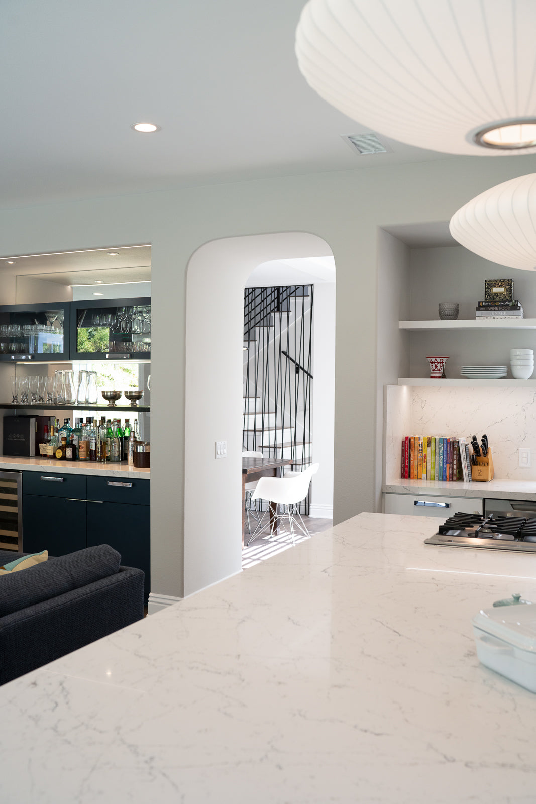 Moreover, Peggy's keen eye for cohesion and ambiance is evident in her adept use of inspiration pieces to unify the kitchen, bar, and living room. Drawing from the client's love for mid-century style, iconic George Nelson bubble lamps and a blue/grey-toned linear fireplace exude timeless elegance, complemented by thoughtful touches like fluted wall slats and an Eames lounge chair for added comfort. Through these inspired design choices, Peggy/Dupuis Design delivers not only visually captivating spaces but also functional and harmonious environments that resonate with the unique personalities and lifestyles of her clients.