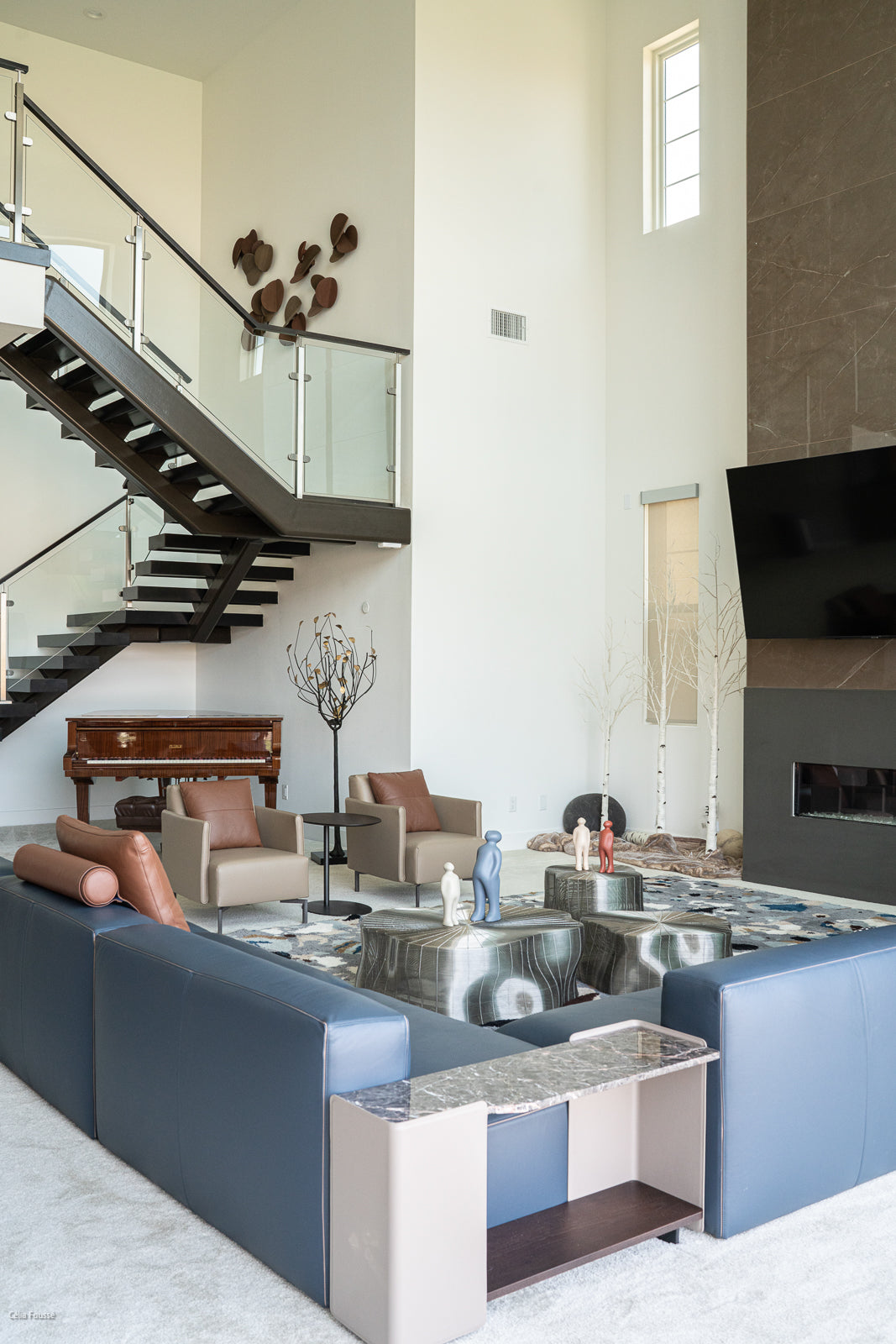 In the living room, Peggy strikes a harmonious balance between comfort and sophistication. A low leather sectional sofa invites relaxation, while the iron tree coffee table from Roche Bobois adds a whimsical touch of nature. Sculptural trees and soft stone poufs further enhance the space, creating a welcoming environment for both relaxation and play.