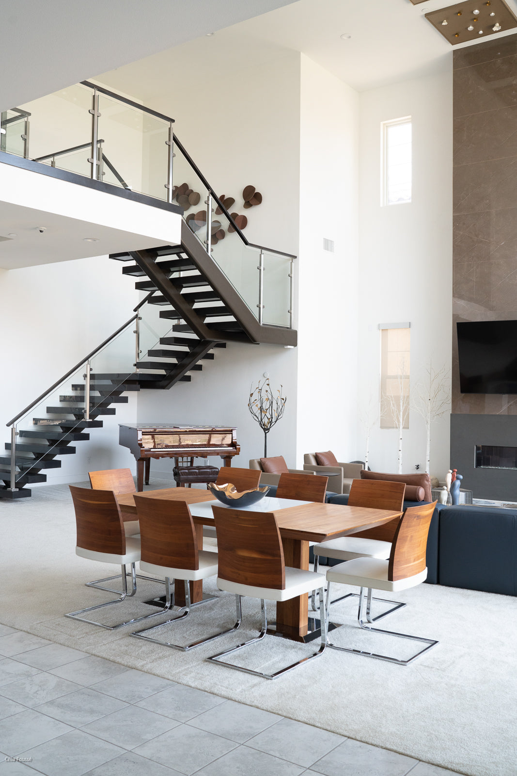 The linear fireplace, dressed in grey quartz, exudes warmth and elegance, becoming a focal point for gathering and conversation. The curated selection of furnishings and accents, including the layered Cielo multi-light pendants from Pablo lighting, adds layers of visual interest and ambiance. From quiet evenings curled up with a book to lively gatherings with friends and family, this living room embodies the perfect blend of style, comfort, and functionality. It's a space designed to be lived in and enjoyed, reflecting Peggy's commitment to creating spaces that are as beautiful as they are inviting.