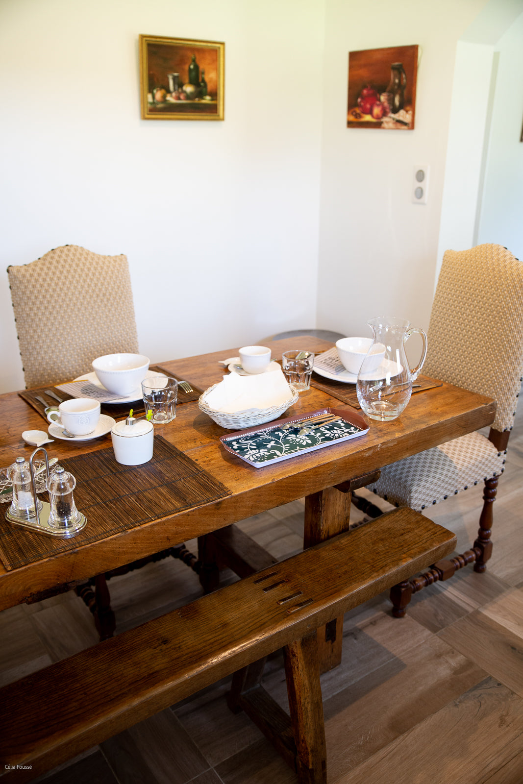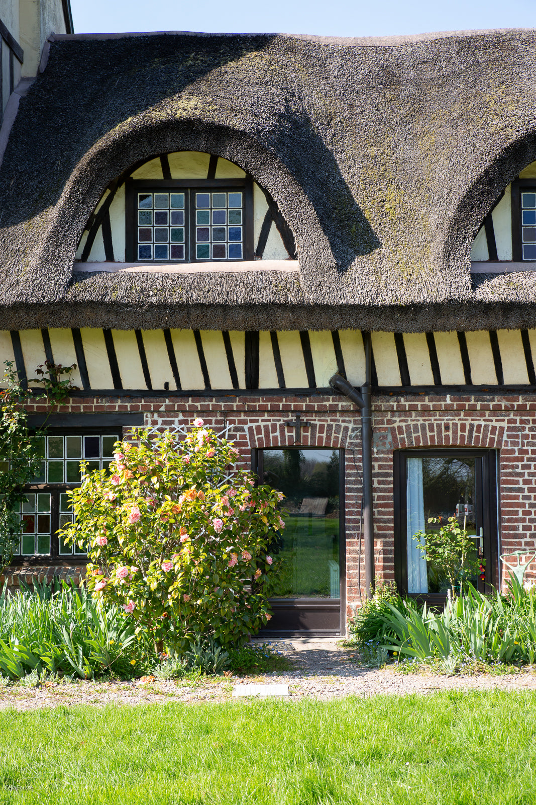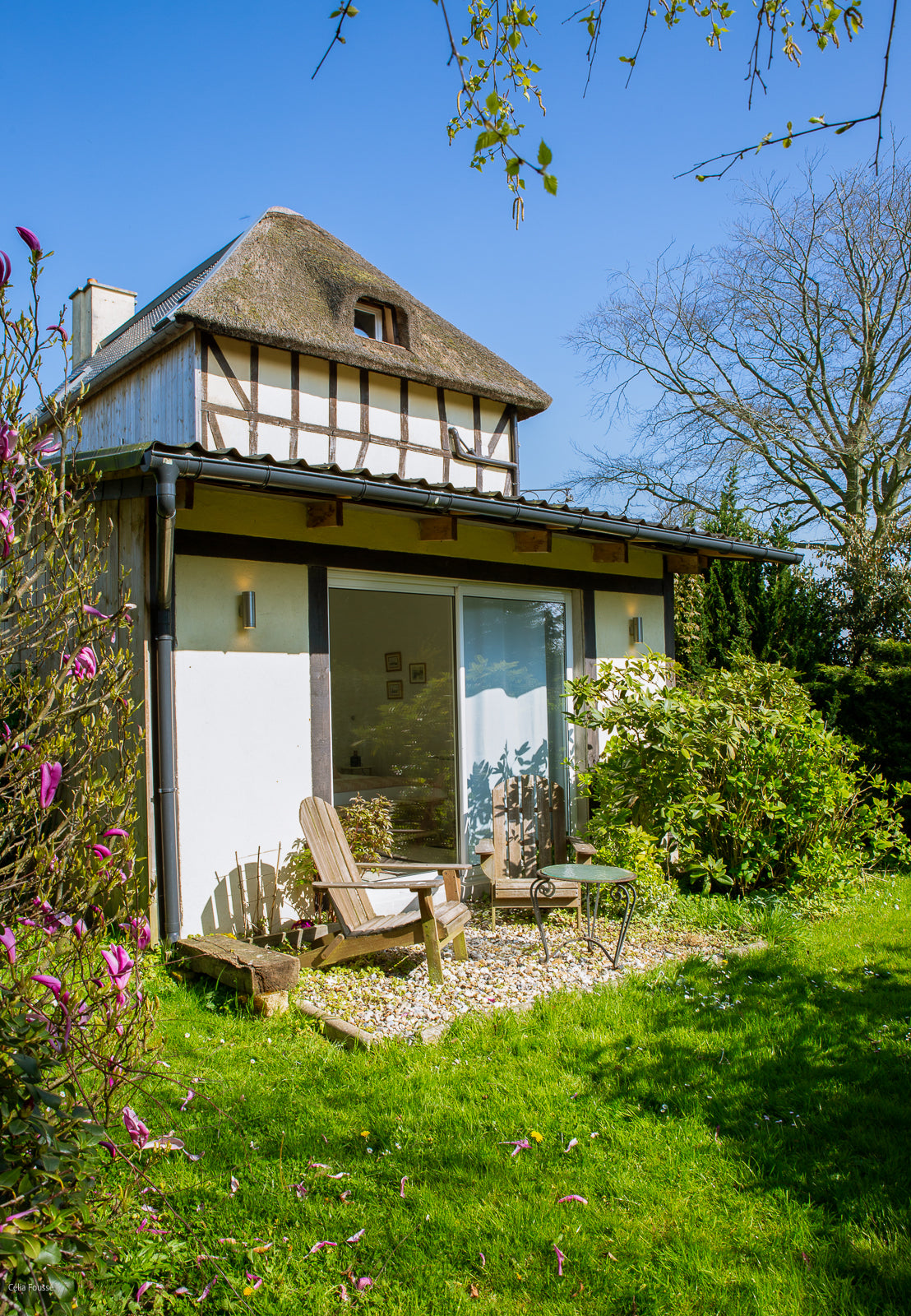 Peggy Dupuis of Dupuis Design beautifully transformed a charming bed and breakfast nestled in the picturesque coastal town of Normandy, France. This enchanting thatched-roof Normand home is set in a lush garden surrounded by majestic trees. The town of Etretat, renowned for its stunning cliffs famously painted by artists like Claude Monet, Eugene Boudin, Gustave Courbet, and Henri Matisse, provides a breathtaking backdrop for this idyllic retreat.