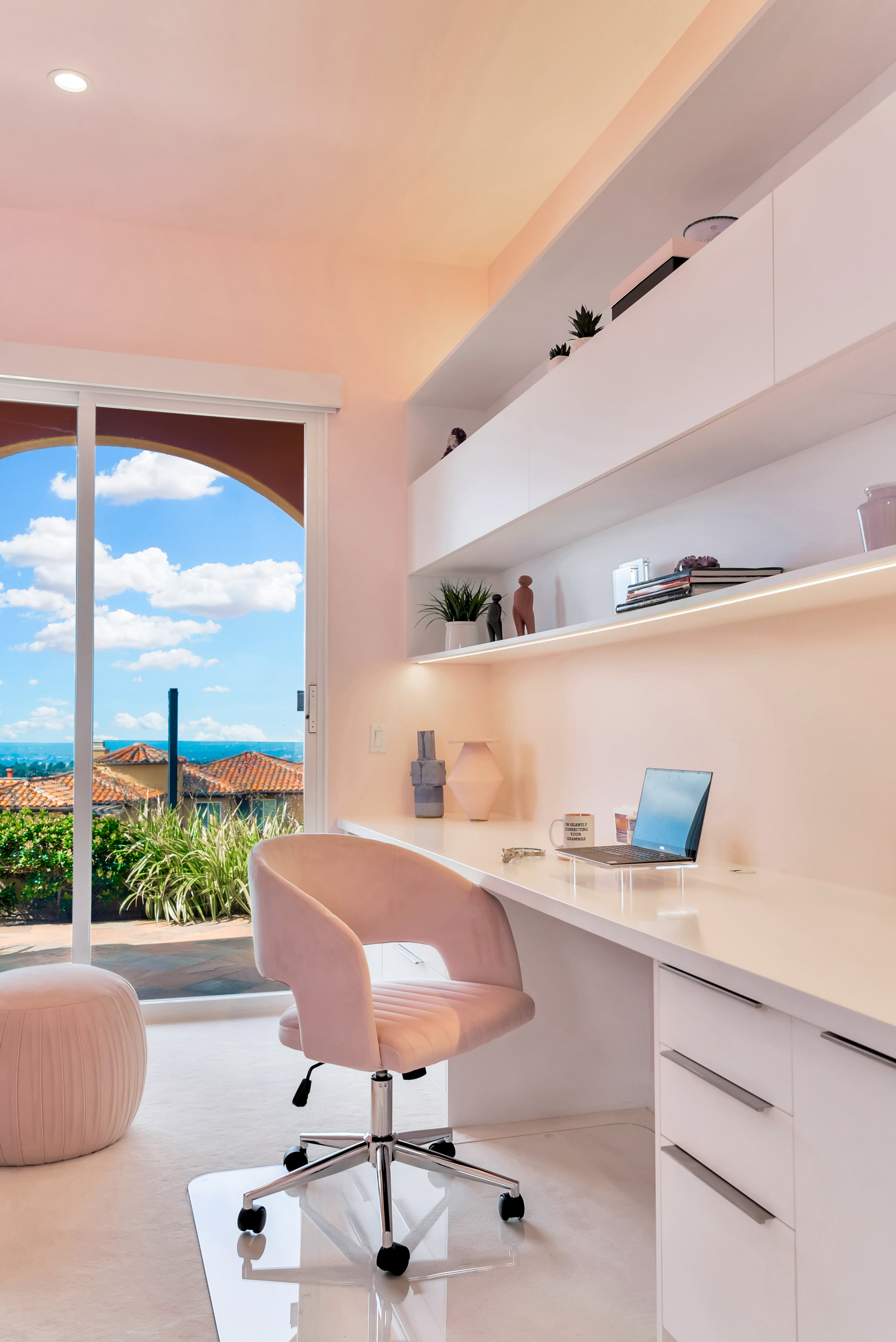 Additionally, Peggy transformed a small, rectangular space into a functional and serene home office that doubles as a guest room. Inspired by a print on the client's wall, she incorporated shades of pink into the design. The office features a desk and ample storage for office supplies, as well as a cozy sofa bed with aubergine velour upholstery that matches the pink wall. This well-designed space allows for calm and productive work while providing a comfortable sleeping area for guests, ensuring versatility and elegance.