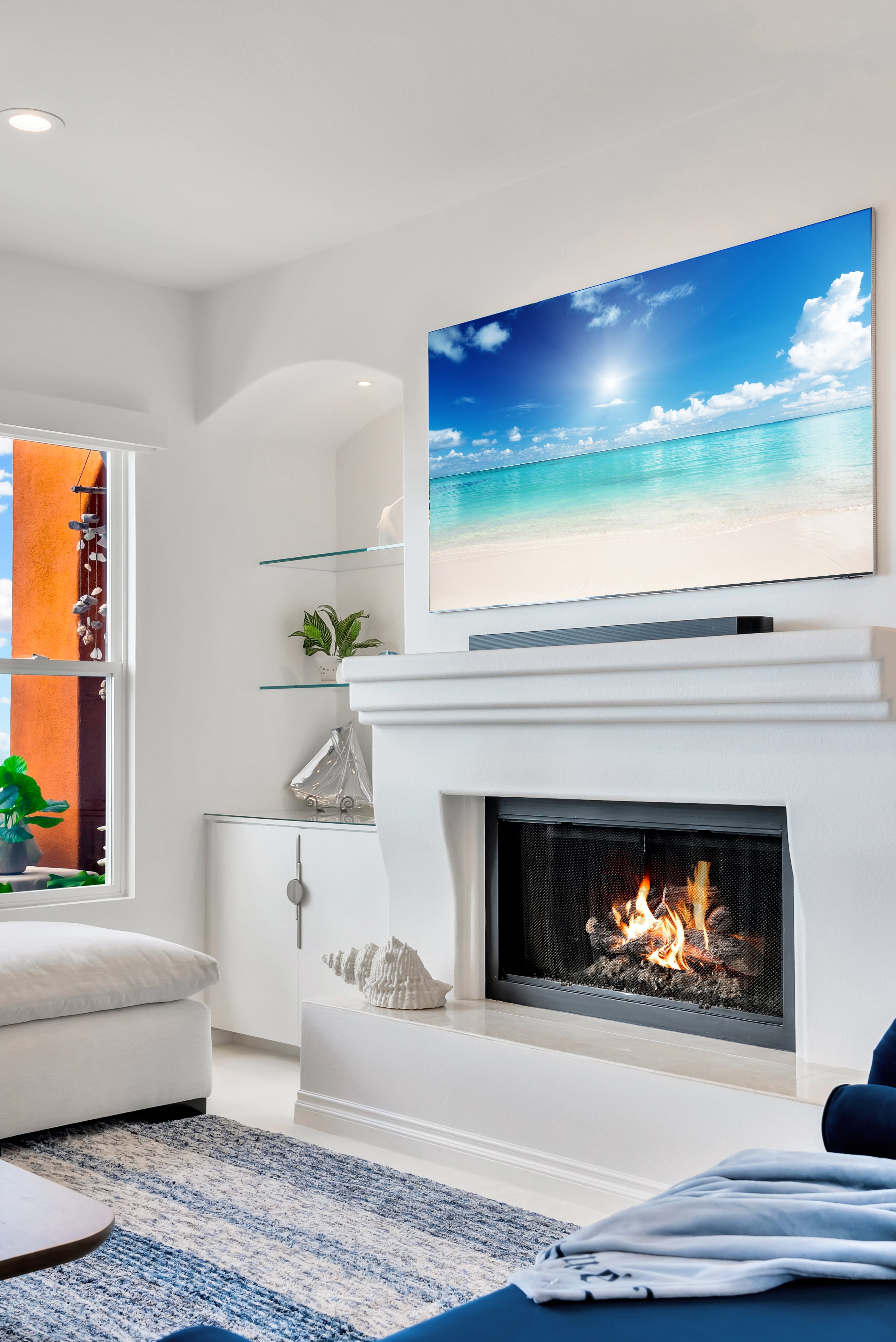 For technology, Peggy suggested replacing the current TV with the Samsung Frame TV. This innovative option transforms the screen into a work of art when not in use, blending seamlessly with the room's overall aesthetic. This not only adds a stylish touch but also allows for a more cohesive and unobtrusive look when the TV is not being actively watched. By incorporating these design elements, Peggy successfully created a more visually pleasing and functional living room space for the client.