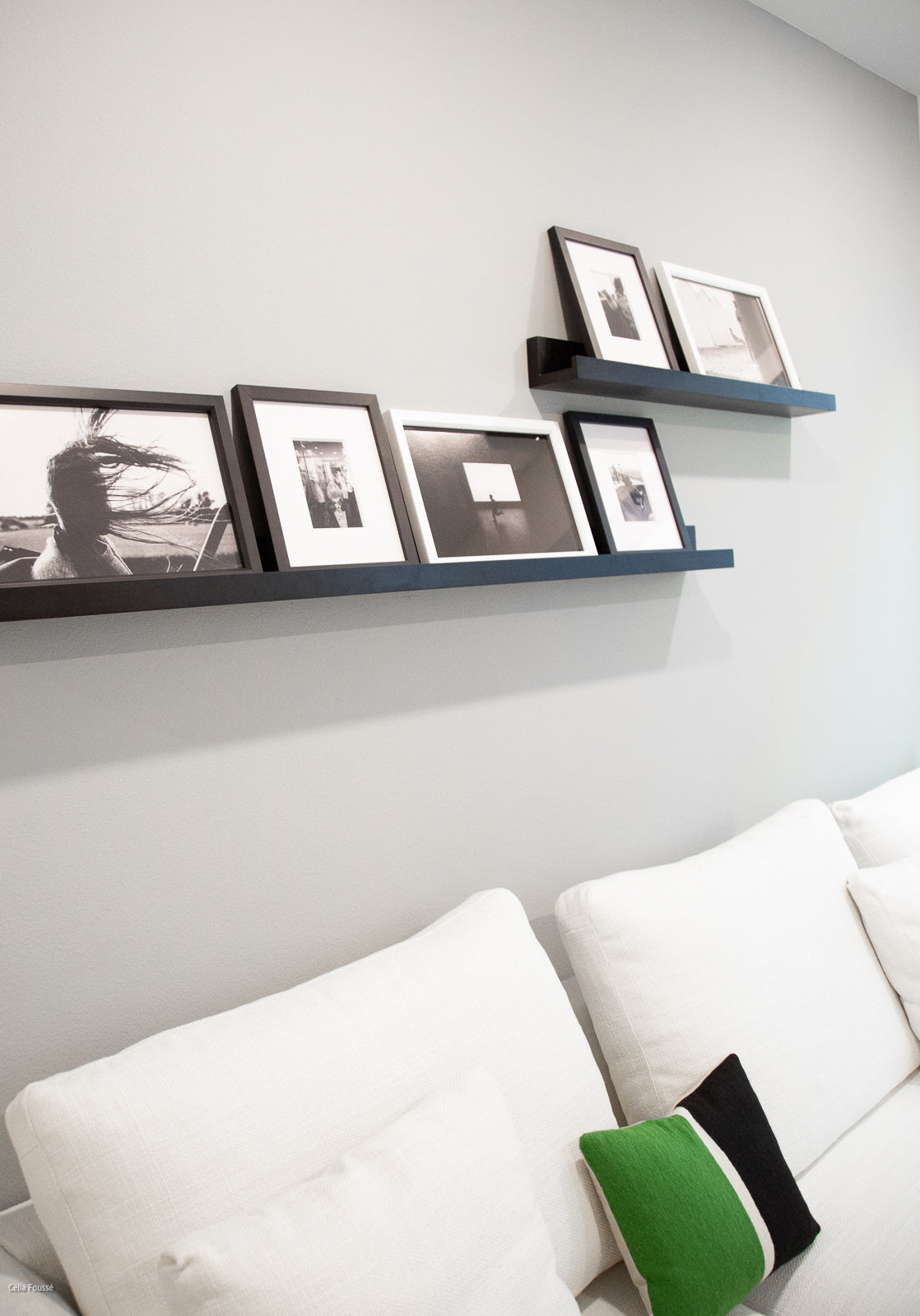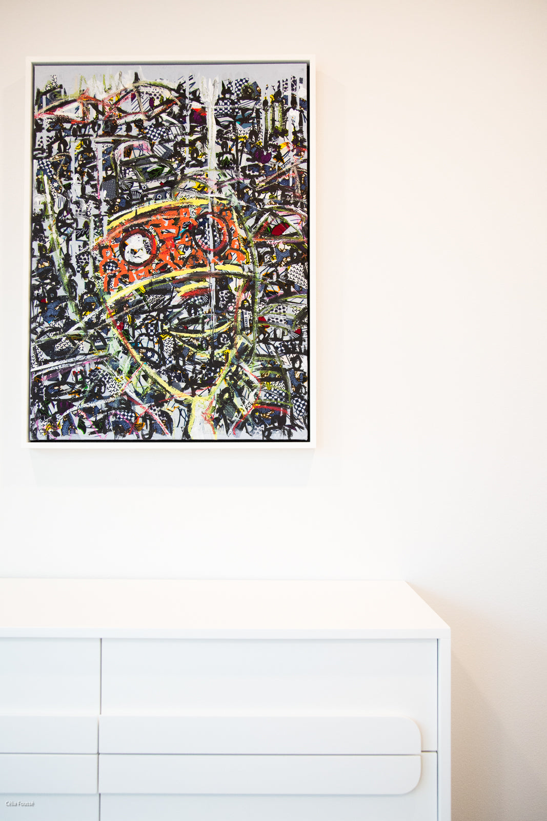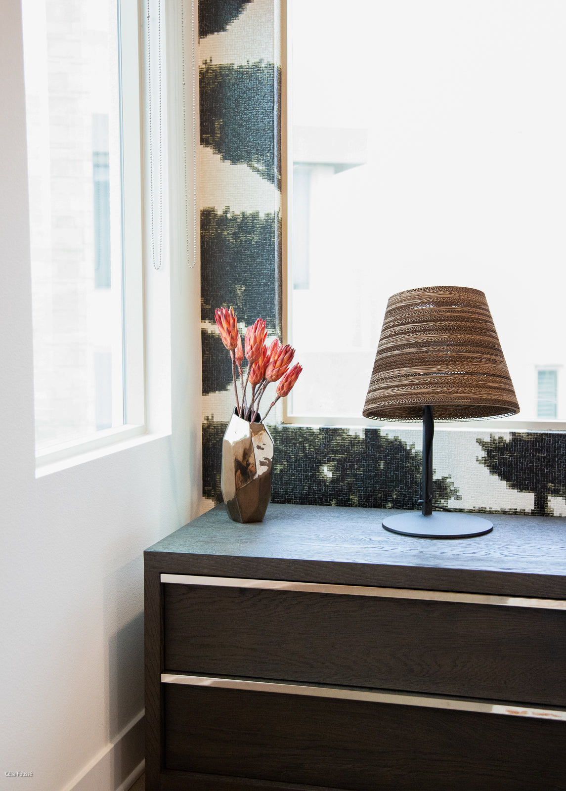 In the family room, we designed a cozy space for lounging and watching TV, accentuated with black and white photos of Celia Foussé, one of our featured artists. Lindell & Co decorative pillows from our collection add style and comfort, creating an inviting atmosphere for the whole family. In the master bedroom, our objective was to create a zen atmosphere using a wallpaper with a molten pearly glass look featuring a pine tree forest backdrop. The room includes a dark wood contemporary four-post bed for contrast, and warm pastel-colored accents such as an area rug, throw, and graphic pillows from Lindell & Co. This design approach created a serene and cozy space for relaxation, reflecting our commitment to creating beautiful and functional living spaces.