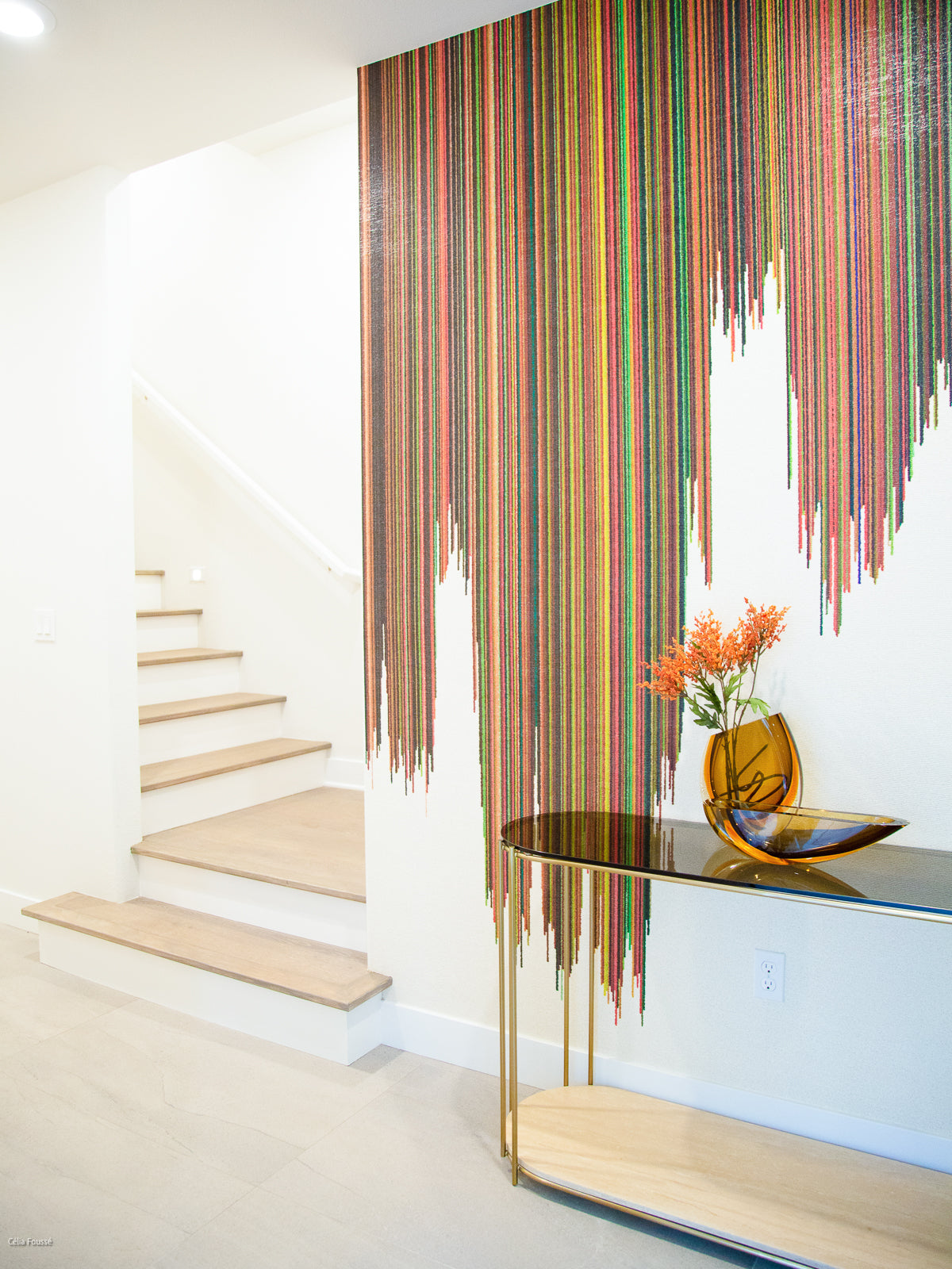 The entryway of this residence is a true statement of elegance and sophistication. We incorporated a stunning beaded wallpaper that showcases cascading warm colors from the ceiling, creating a visually striking and inviting atmosphere as you enter the space. Complementing the wallpaper is a clean and clear bronze glass console top with a travertine bottom table, adding a touch of refinement. To enhance the decor, beautiful blown glass vases from the Dupuis Design collection by artist Regina Madeiros were added, bringing a unique and artistic element to the entryway that makes it truly stand out.