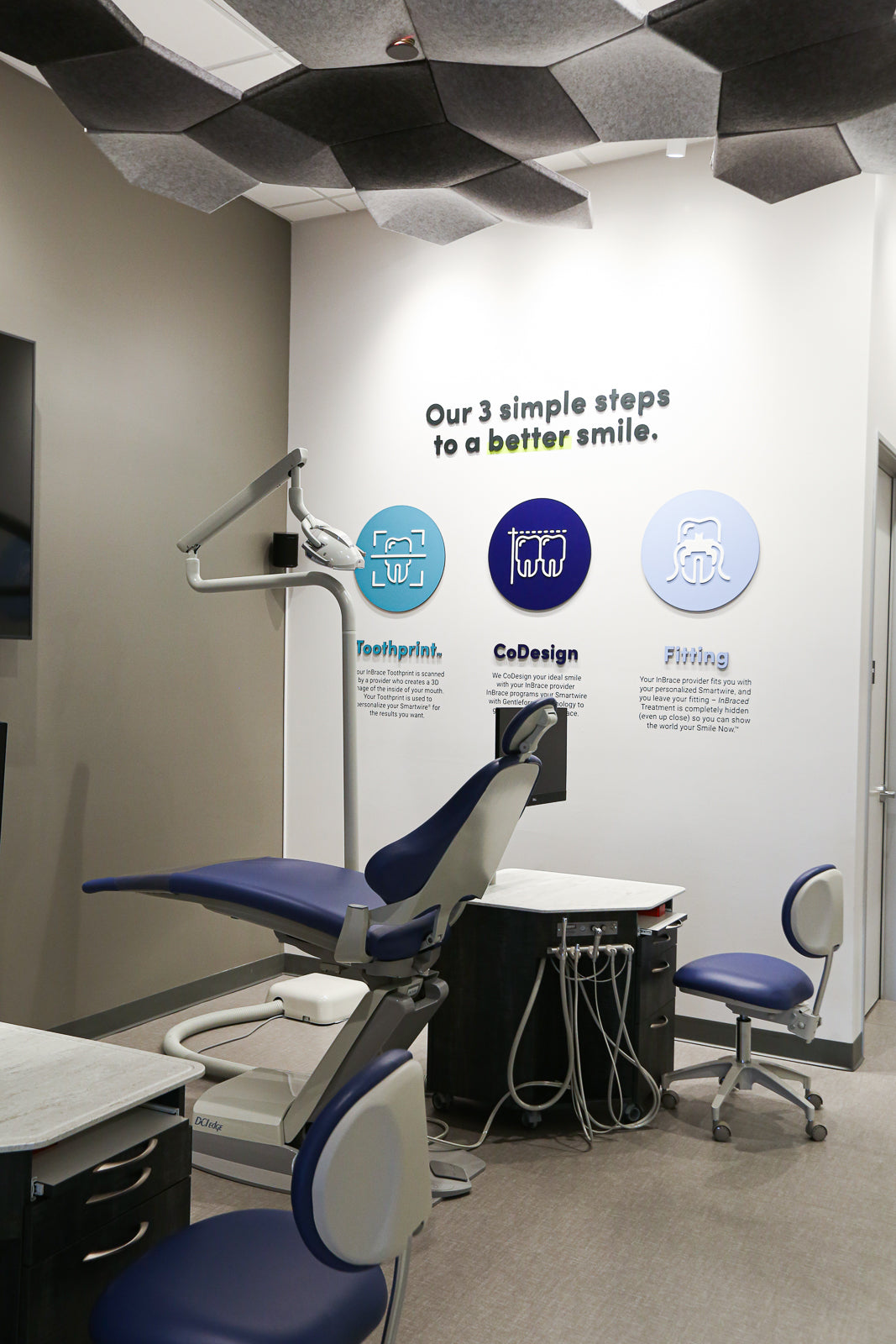 The resulting design is unique and atypical for an orthodontic office, reflecting the innovative nature of Inbrace's technology. The finishings, furniture, and decor all draw inspiration from the sleek and sophisticated Inbrace wire, creating a cohesive and modern aesthetic. Every element, from the detailed cabinetry optimized for efficient use to the strategically placed artwork, communicates the advantages of using Inbrace over traditional braces or aligners. Each studio's location and surroundings were also carefully considered to ensure the design complemented its specific context.