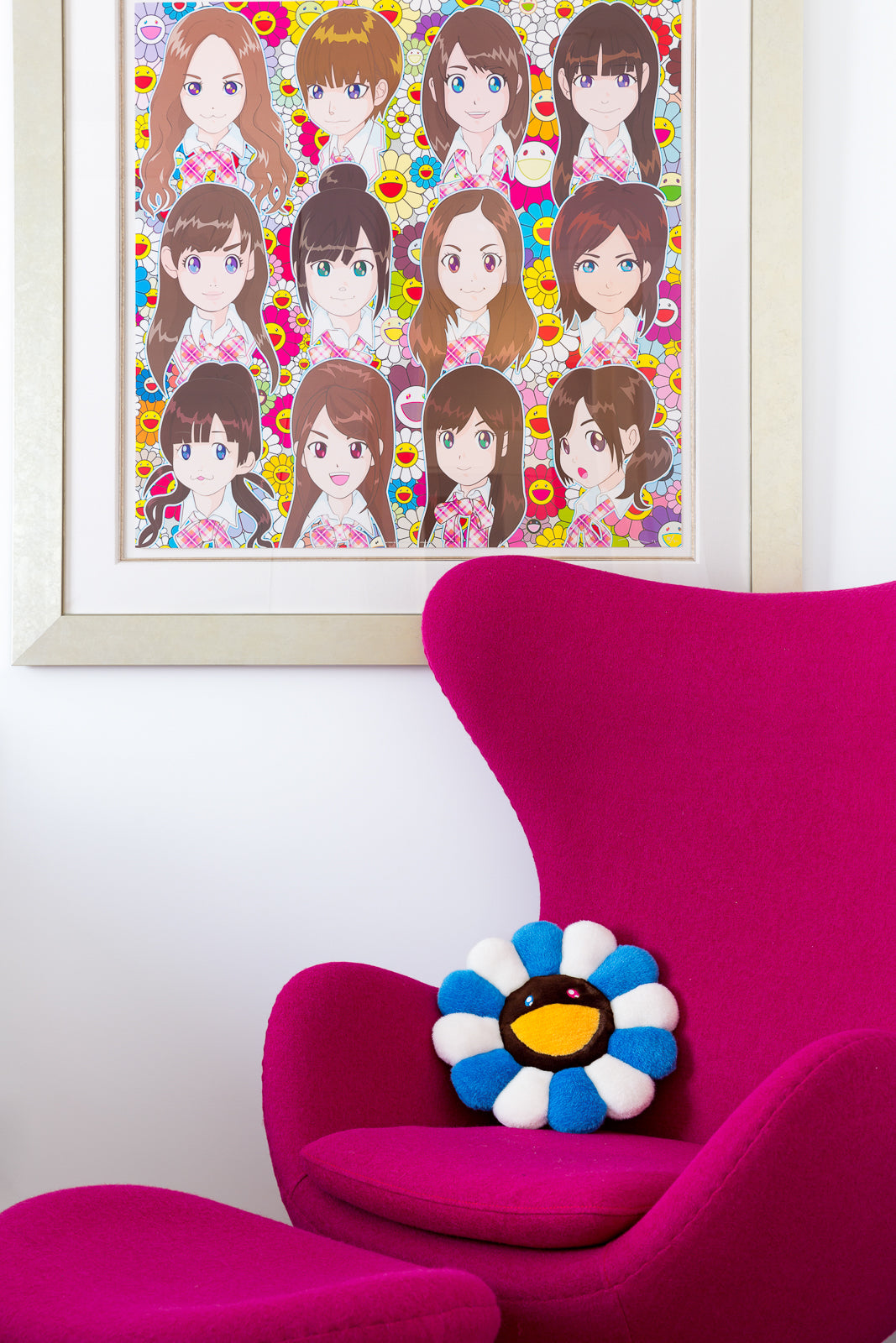 Dupuis Design was tasked with transforming a traditionally dark and ornate home into a stark, contemporary museum-style residence, perfectly showcasing the clients' art collection. The original style, characterized by yellow, brown, wrought iron, and crème tones, was completely reimagined into a vibrant and minimalist space. With a keen eye for clean design, Peggy infused the home with fun, bright colors and iconic French brand furniture, seamlessly integrating the clients' passion for Japanese culture and art. This included their cherished collection of superflat style artwork from Murakami, anime art, and vintage posters, creating a unique and dynamic living environment.