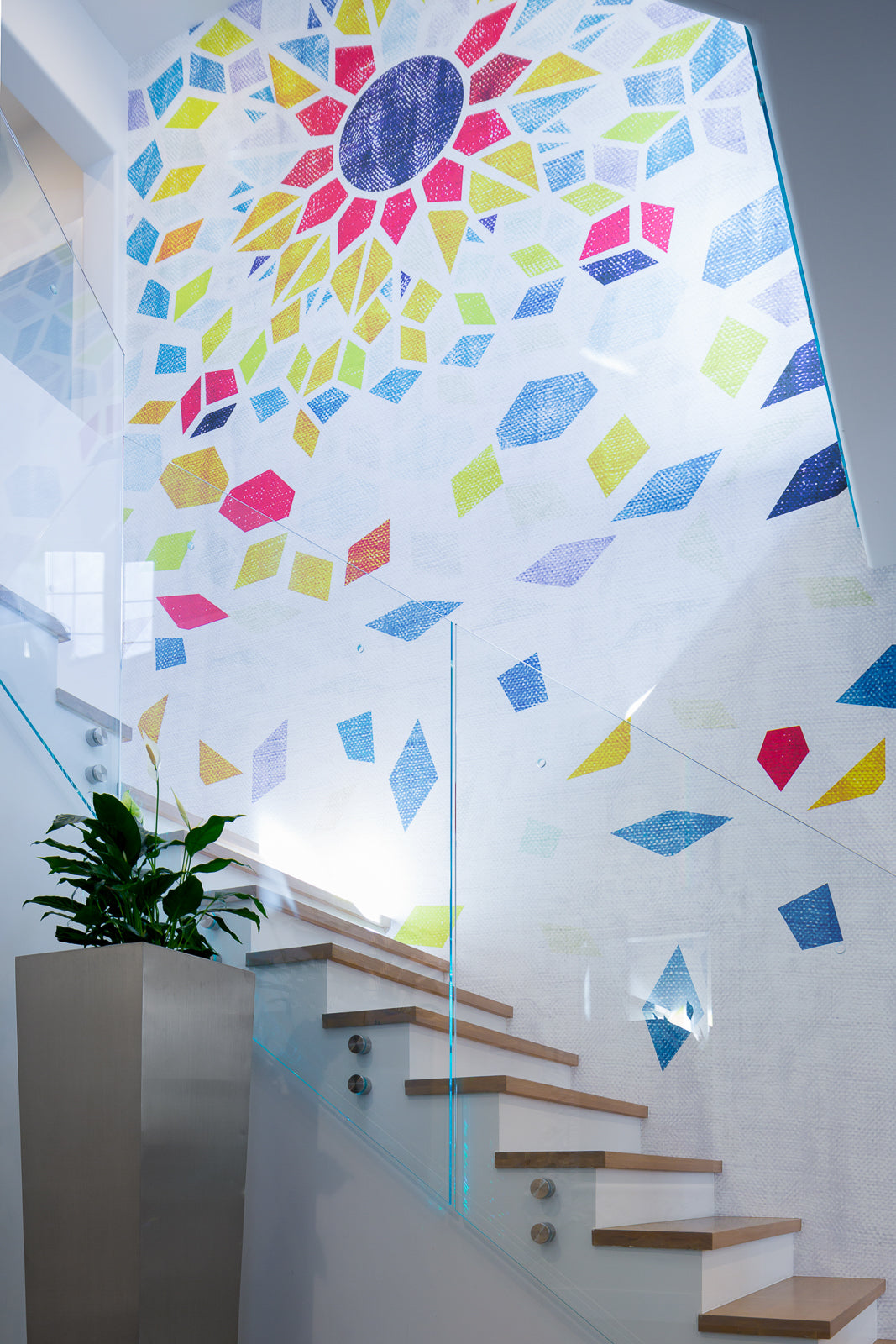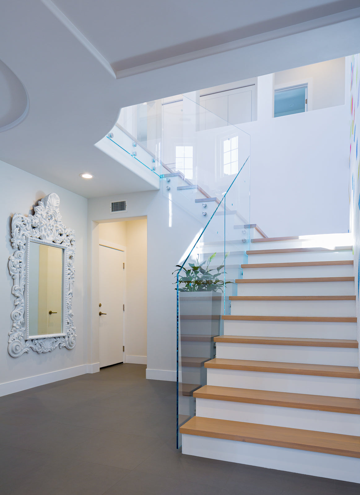 Throughout the home, Peggy paid meticulous attention to every detail. The teenage daughter’s bedroom, with its striking red iconic egg chair and vibrant Murakami print, exudes artistic flair. The younger daughter's serene oasis features a calming teal color scheme and a Murakami-inspired rug, complemented by the iconic ball chair by Eero Aarnio. The transformation continues into the daughter's bathroom, where a clean all-white aesthetic is enhanced by a captivating wave-patterned porcelain backdrop. The entry staircase now boasts frameless glass guardrails and light oak treads, framed by a custom pop art wallpaper inspired by the Reims Cathedral vitrail.