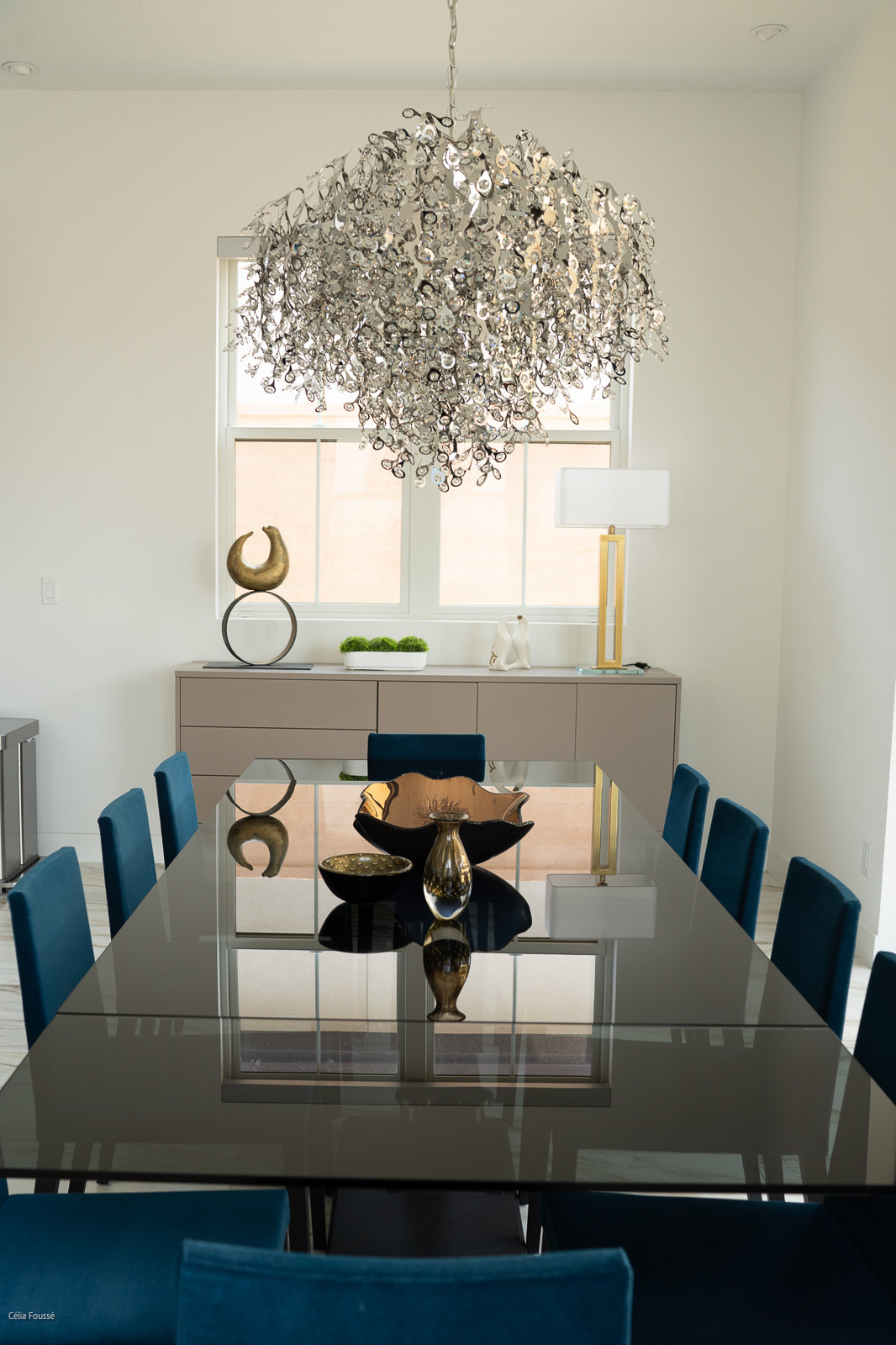 Dupuis Design crafted an elegant dining room in San Juan Capistrano, blending functionality with sophistication. The centerpiece is a Cattelan Italia dining table, complemented by ocean blue velvet chairs, under the brilliance of a Maxim Comet chandelier. The table is adorned with Dupuis Design's curated collection, including Seguso's Balloton blown glass bowl and vase, and Regina Medeiros' refined glass bowl. A warm grey sideboard, highlighted by a gold bronze sculpture by Jacque Vanroose and a gold brass base table lamp from Eicholtz, adds refinement and balance to the space.