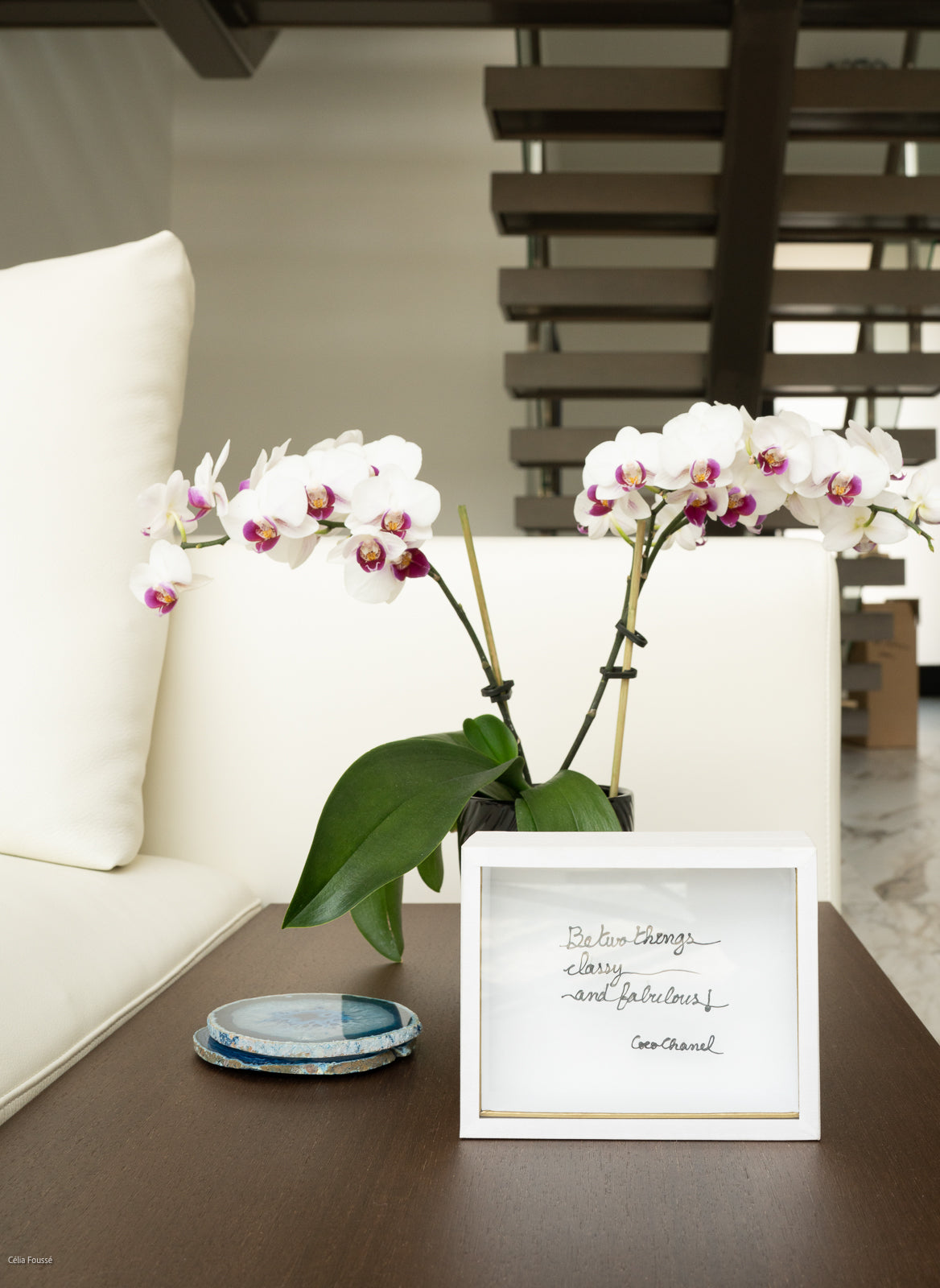 Enhancing the room's aesthetic, Peggy introduced the Boynton mirror with its 3-dimensional triangle facets, transforming a plain white wall into a dynamic focal point. This design element adds depth and texture, interacting beautifully with Moooi random lights, creating a harmonious blend of geometric elegance and brilliance. The gold grass cloth wallpaper serves as a luminous backdrop, complementing the mirror and coral glass artwork, adding an oceanic touch. The Usm Haller modular furniture, both visually appealing and highly functional, offers customization and adaptability, making it ideal for various needs.