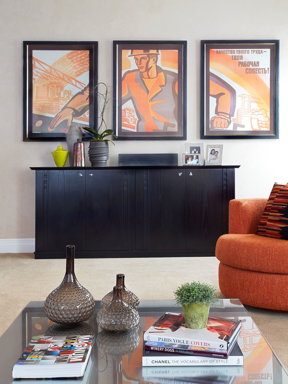 In the family room, a large grey sectional sofa serves as the centerpiece, adorned with decorative pillows in an orange theme to echo the colors of the triptych. Two large coffee tables in front of the sofa provide ample space for drinks and snacks during entertaining or family movie nights. An orange round-shaped swivel chair adds visual interest and additional seating. This combination of elements ensures the family room is both versatile and comfortable, ideal for relaxation and socializing.