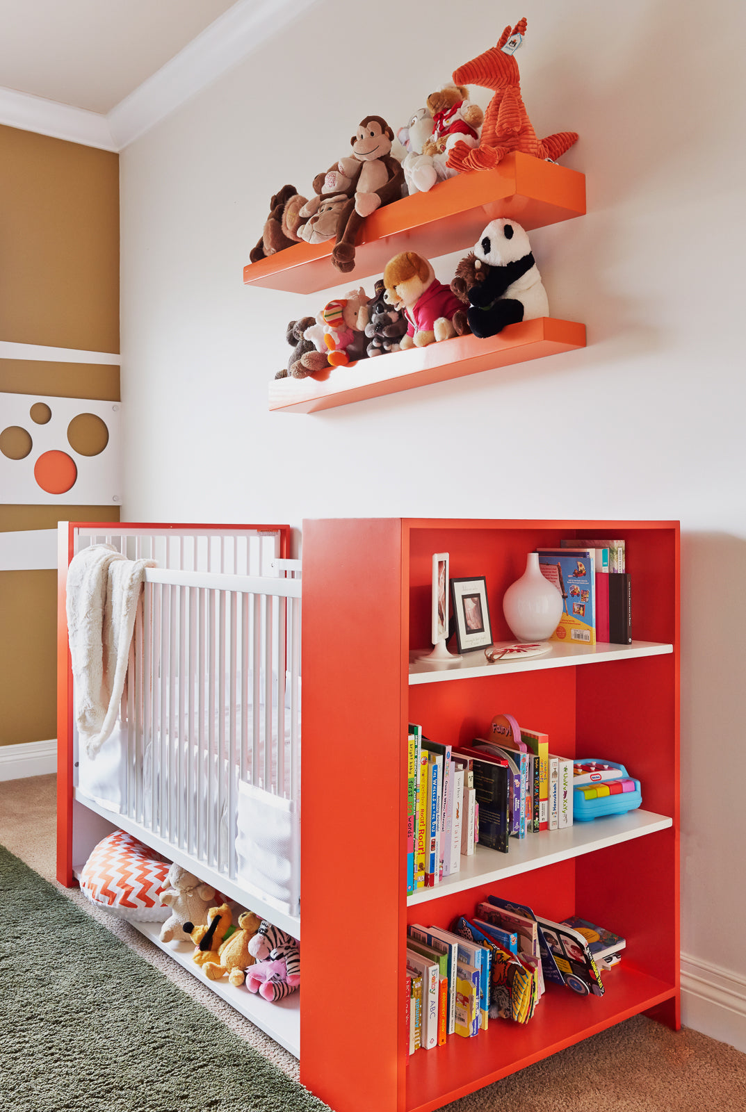 The nursery was designed to be special for the client's first child, featuring an American-made, sustainable ducduc crib with integrated storage and a bookcase. The color orange was chosen to continue the design theme from the living room art print. A yellow-orange backdrop complements the crib, creating a harmonious space. The wall design features dynamic circles inspired by round 3-tier Ikea pendants. To ensure comfort for the mother, a neutral grey recliner was incorporated, providing a cozy seating option. The combination of the orange crib, yellow-orange backdrop, and grey recliner creates a perfect balance, making the nursery inviting for both mother and child.